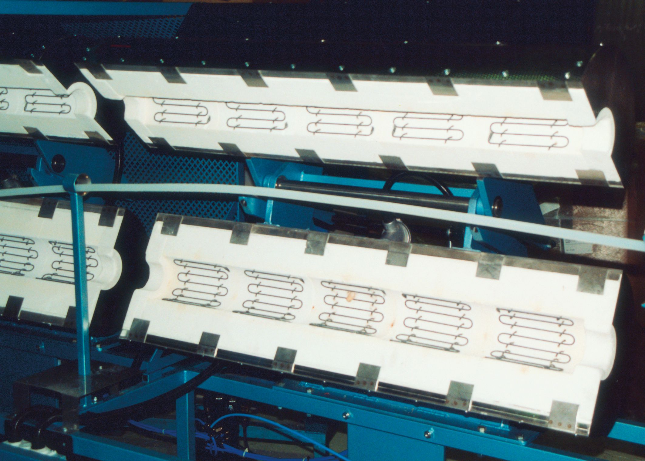 The half cylinders were chosen in this case since the heater must open easily and total of 20 modules were mounted in two ready-to-install cassettes. The temperature in the heater is 700 – 800°C (1290 – 1470°F) which gives a moderate element temperature of 1340°C (2445°F). The elements are wired in two series connected groups directly to the line voltage hence no transformer is needed. The power is regulated by a thyristor. Kanthal supplied the cassettes and the electric control unit and Uponor completed the assembly by adding the opening devices and other equipment. The heater was installed in May 1996 and has since been in continuous operation.